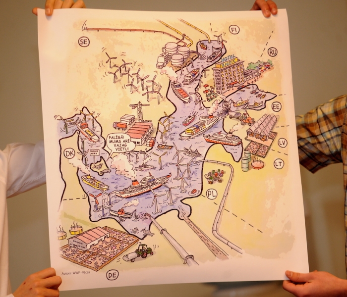 Для того, чтобы напомнить латвийским должностным лицам о необходимости активнее думать об интегрированном управлении Балтийским морем, организаторы кампании «Сила в чистом море» вместе со школьниками подарили 8 апреля парламентской подкомиссии по охране среды карту Балтийского моря, на которой символически изображено перегруженное Балтийское море. Кстати, осенью прошлого года многие ученики 11-х классов послушали лекцию о Балтийском море и приняли участие в игре «Парламент хозяев моря».