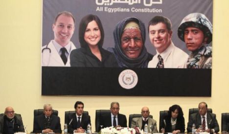 Конституционное собрание Египта на пресс-конференции выступило с проектом конституции, принятие которой может покончить с кровавыми беспорядками в стране, которые продолжаются с июля, когда был свергнут президент Мохаммед Мурси. Однако на конференции за спинами ее участников висел плакат, превративший решающий политический поворот в трагикомическую ситуацию.