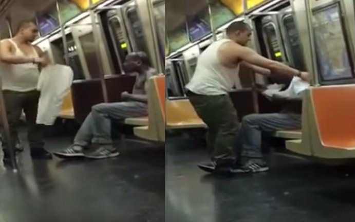 Один из пассажиров нью-йоркского метро заметил, что с ним в вагоне едет полуодетый мужчина. Тогда пассажир снял с себя майку и отдал ее и шапку бездомному, а затем поинтересовался, не нужно ли этому мужчине в больницу.