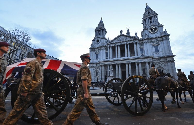 Рано утром в понедельник, 15 апреля, в центре Лондона состоялась генеральная репетиция военного парада, который станет центральным событием похорон Маргарет Тэтчер.