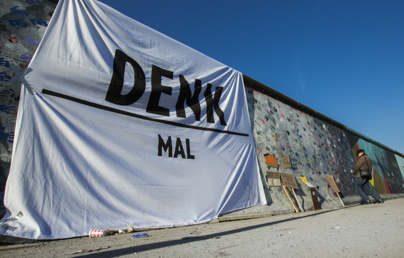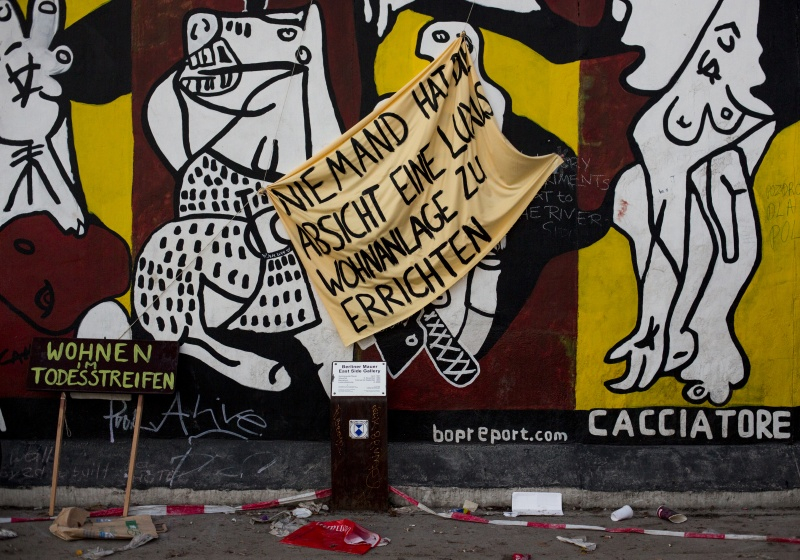 Тысячи протестующих берлинцев вынудили застройщика минимум на две недели отказаться от демонтажа блоков из расписанного художниками отрезка Берлинской стены, уцелевшего после объединения Германии.