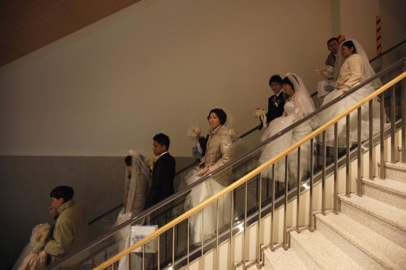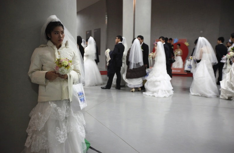 Конкуренции среди невест не было и быть не могло: все женщины были одеты в одинаковые белые свадебные платья и даже держали одинаковые букеты. Следует отметить, что и все женихи надели черные классические костюмы с красными галстуками. На плечи у всех брачующихся были накинуты традиционные белоснежные шарфы с религиозными символами.