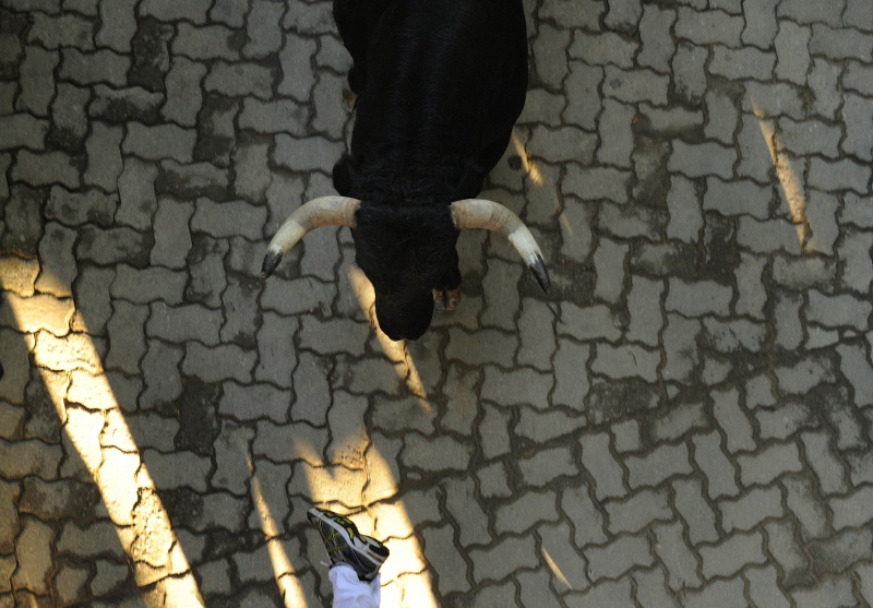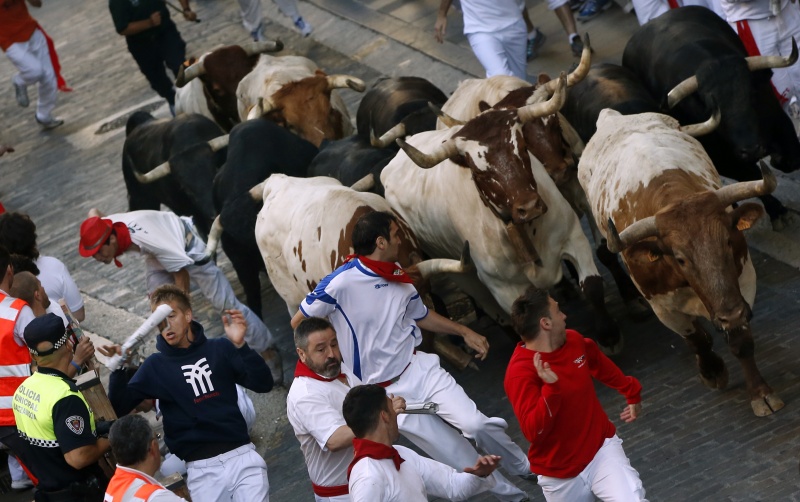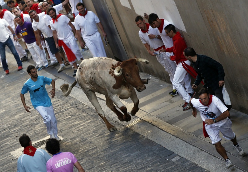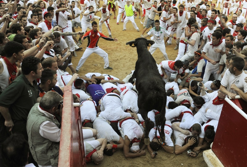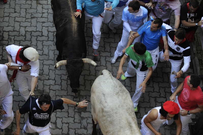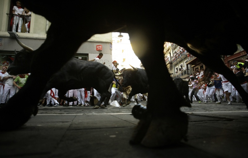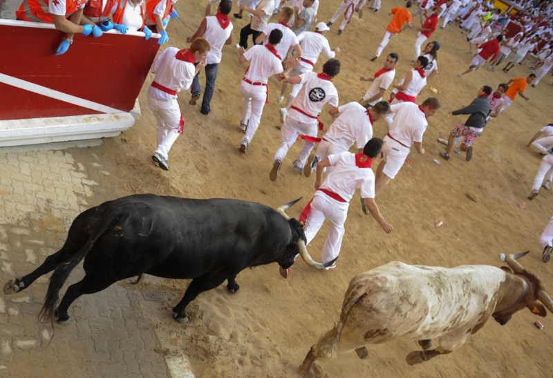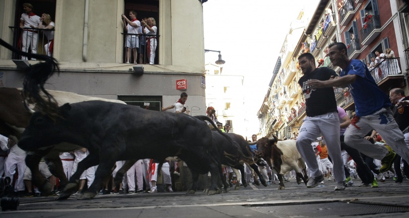 В городе Пампилон, на севере Испании, проходит ежегодный праздник Сан-Фремин, гвоздем которого традиционно становится забег нескольких сотен человек по улицам города с шестью взрослыми и шестью молодыми быками.