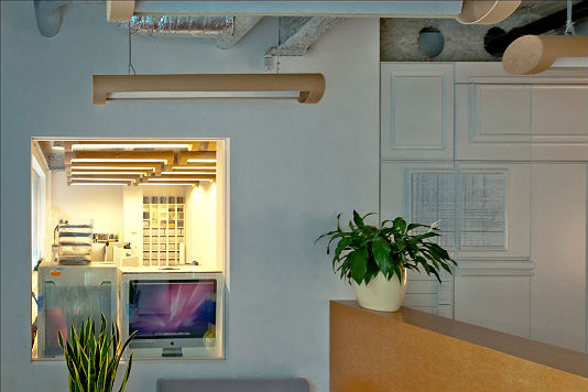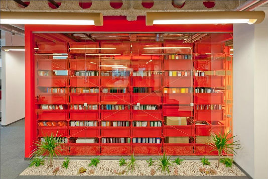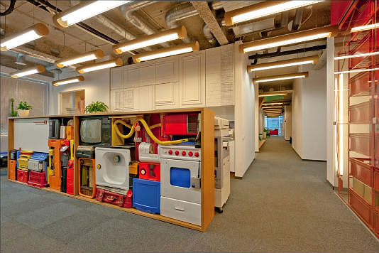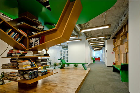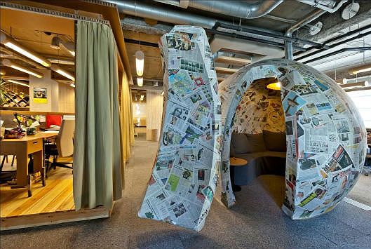 Интерьер офиса полностью создан из вторично переработанных материалов. Таким образом компаниям удалось объединить творчество с дизайном, дружественным окружающей среде.