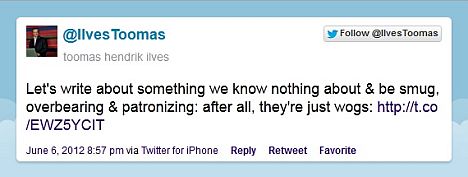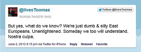 Ильвес ответил на это несколькими записями в своем блоге Twitter, выражая обиду и заявляя, что Кругман не имеет понятия, о чем говорит.