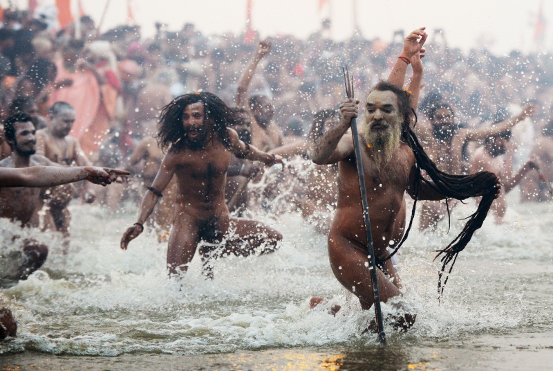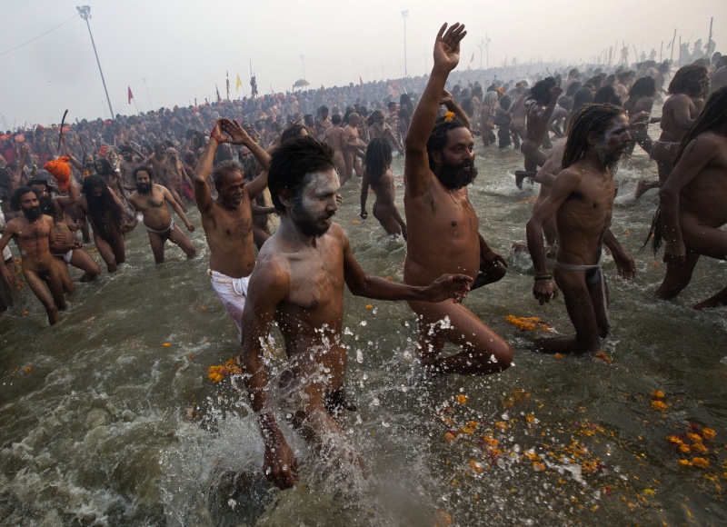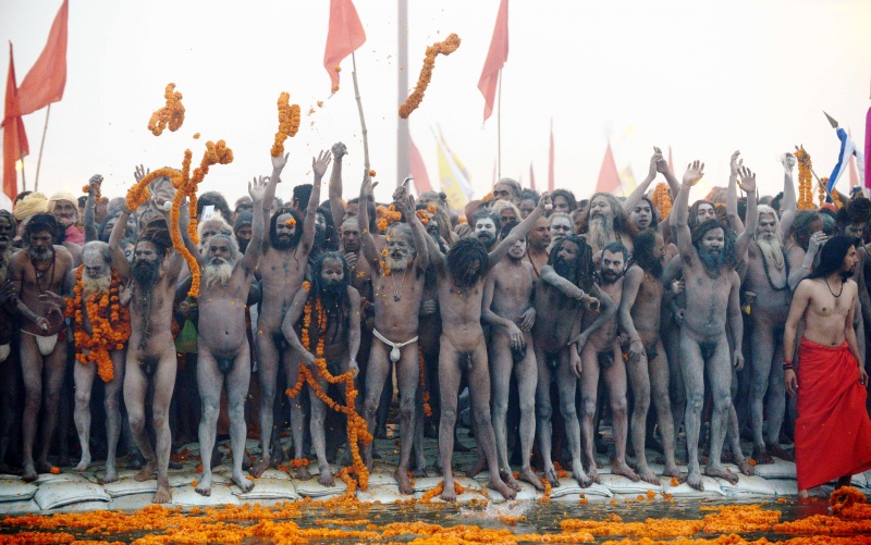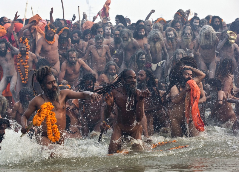 Кумбха-мела официально начинается в понедельник на рассвете, когда группы обнаженных и вымазанных в пепле садху окунаются в холодные воды в месте слияния Ганга и Ямуны, которое носит название Сангам.