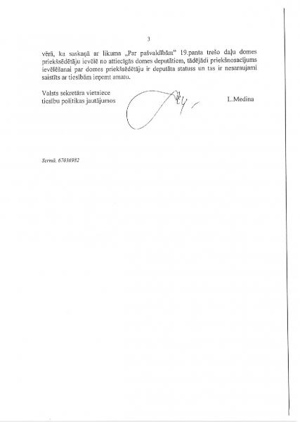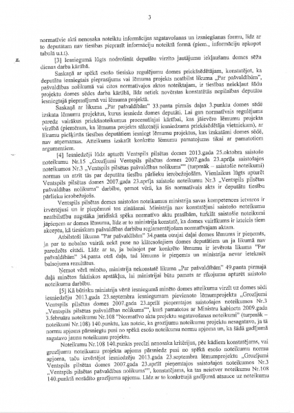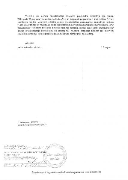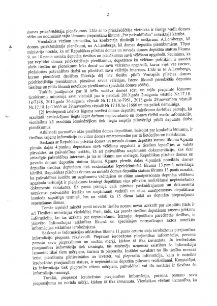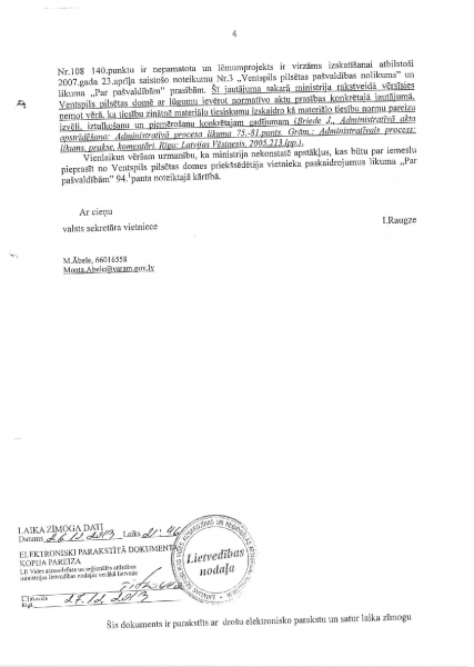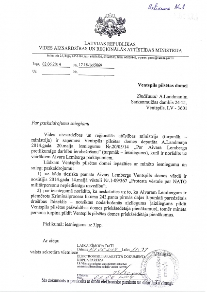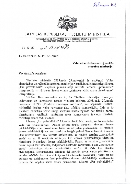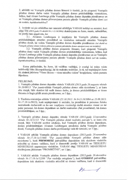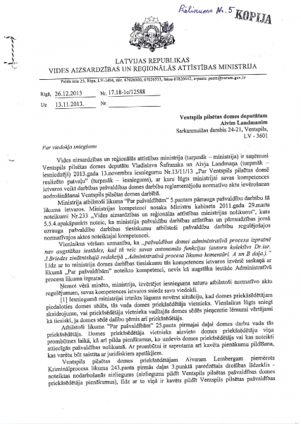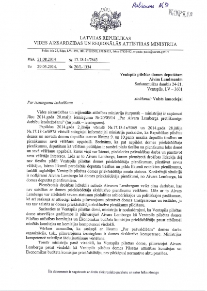 К сожалению, Минохраны среды и регионального развития скрывает находящееся у него объяснение Минюста (от 23 октября 2013 года) и продолжает утверждать, что отсутствие Айварса Лембергса как председателя Вентспилсской думы никак не мешает находиться в Вентспилсской думе, чтобы исполнять обязанности депутата Вентспилсской думы и чтобы на основании выданной Вентспилсской думой доверенности представлять должностных лиц и учреждения думы.