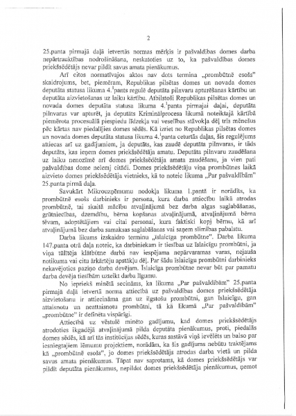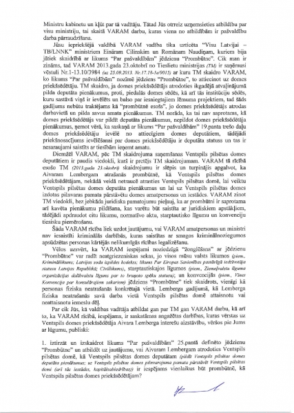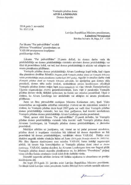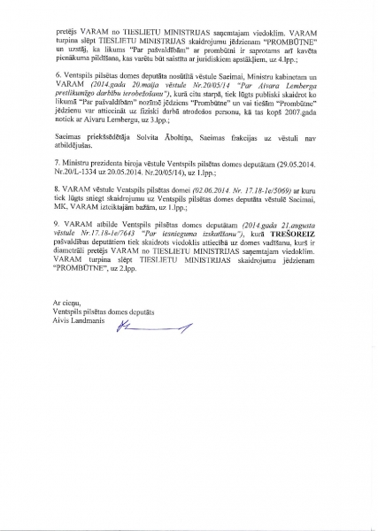 Он продолжает: «Вы наверняка знаете, что по решению суда от 2007 года Айварсу Лембергсу запрещено исполнять обязанности председателя Вентспилсской думы и председателя правления Вентспилсского свободного порта. Также Вы знаете, что Айварс Лембергс как председатель Вентспилсской думы высказывается на пресс-конференциях и публичных мероприятиях, что вынуждает спрашивать: исполняется ли назначенная ему мера пресечения. Вы наверняка в курсе о статье 25 Закона о самоуправлениях, в которой сказано, что заместитель может замещать председателя думы только в его отсутствие или тогда, когда председатель думы уволен или ушел в отставку.