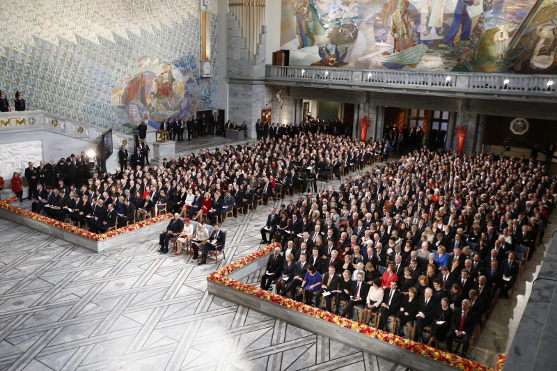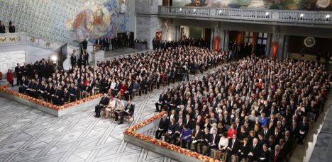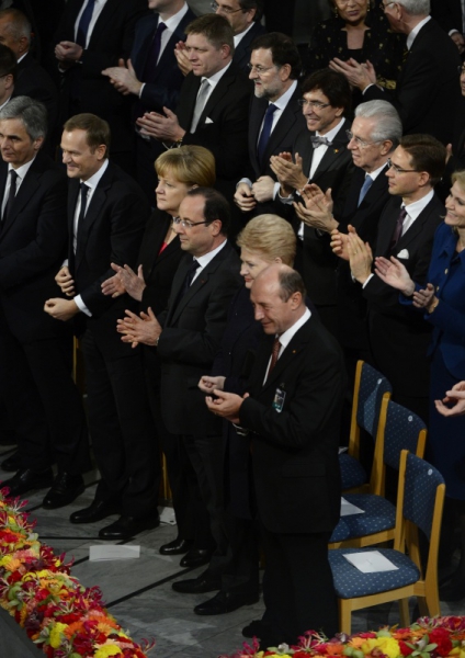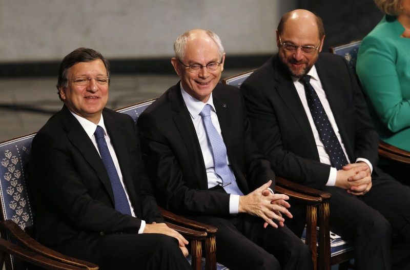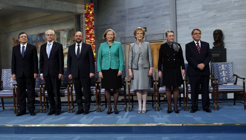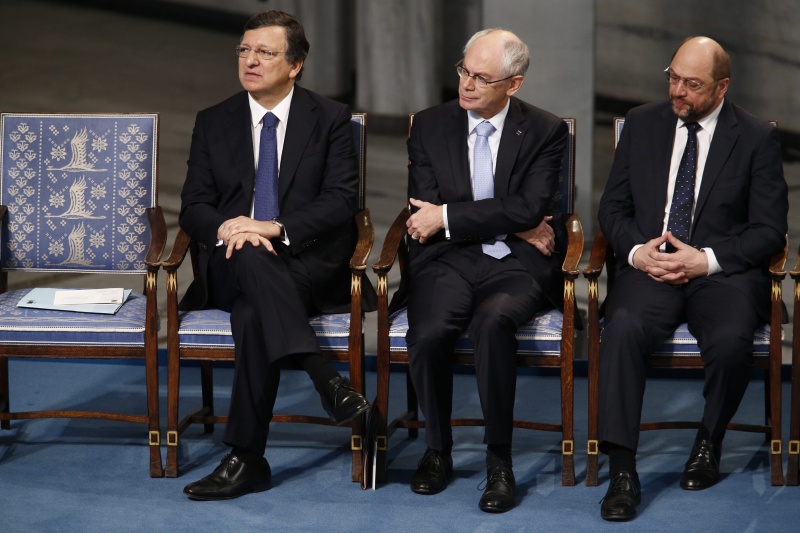 Награду, присужденную ЕС за благотворное влияние на ситуацию в Европе, получили в Осло председатель Еврокомиссии Жозе Мануэль Баррозу, председатель Европарламента Мартин Шульц и президент Европейского совета Херман ван Ромпей, пишет Lenta.ru.
