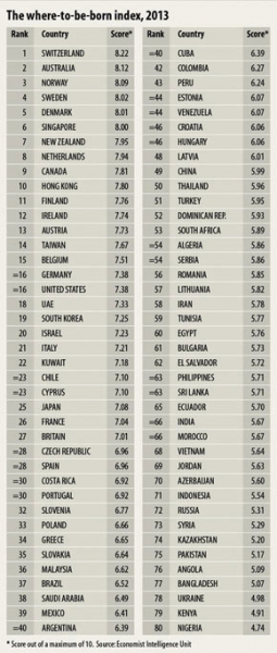 Дочерняя компания журнала The Economist – Economist Intelligence Unit (EIU) – провела анализ различных данных и попыталась рассчитать, какие страны смогут обеспечить рожденным в них в 2013 году детям самую надежную, обеспеченную и здоровую жизнь.