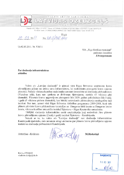 И, наконец, очередной риск для престижа Латвии заключается в прямой лжи, которую инициаторы проекта RFT и Рижская дума распространяют в публичном пространстве. Так, во всех официальных документах говорится, что общий объем минеральных удобрений, поступающих от «Уралхима» для перегрузки терминалом RFT, будет составлять 2 млн. т. в год, а единовременно на складах будет храниться 180 тыс. тонн. Но от общества скрывается, что на самом деле российская сторона проекта договорилась с латвийской стороной, что переваливаться будет 5 млн. т., больше, чем весь объем годового производства Уралхима». Вот подтверждение – письмо о создании железнодорожной инфраструктуры для перевозки 5 млн. тонн: