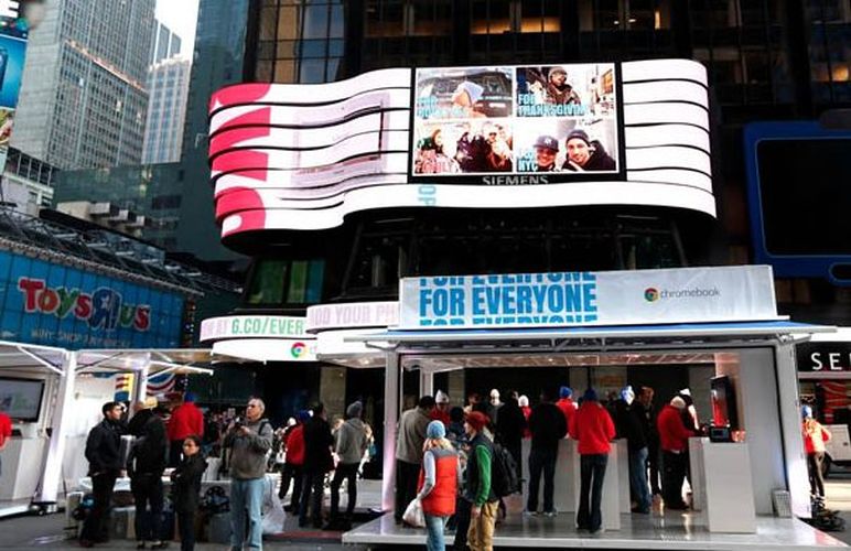 Компания придумала новый маркетинговый трюк под названием For Everyone (для каждого), в рамках которого людей просят ответить на очень простой вопрос и загрузить в интернет любую фотографию. Ответив на вопрос «Для чего предусмотрен новый портативный компьютер компании Chromebook?» и загрузив на сайт свою фотографию, портрет практически любого желающего может украсить Таймс-Сквер.