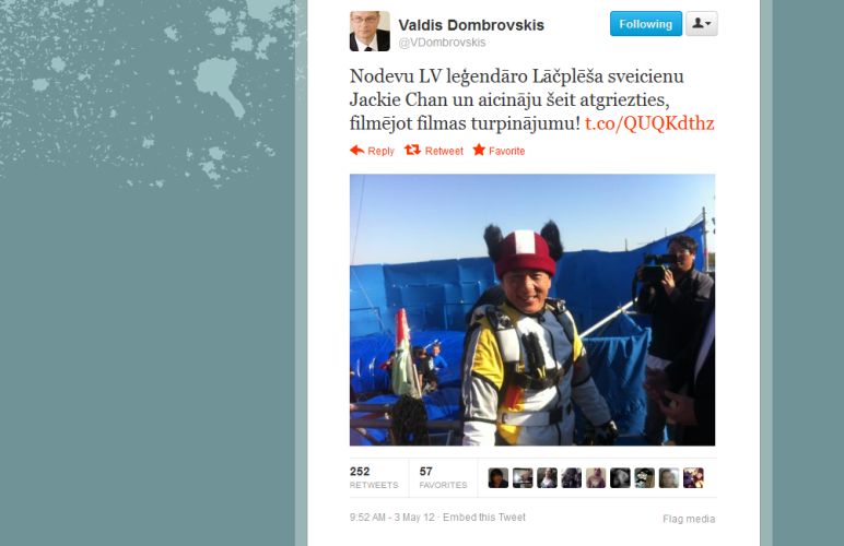 Сообщения, написанные самим премьером, это в основном различные поздравления или соболезнования, а также мнение по вопросу референдума о языке. Самый популярный твит Домбровскиса – фотография актера Джеки Чана (Jackie Chan) в шапке Лачплесиса. Изображение сопровождается комментарием: «Передал Джеки Чану привет от легендарного в LV Лачплесиса и пригласил его вернуться, чтобы снять продолжение фильма! pic.twitter.com/QUQKdthz».