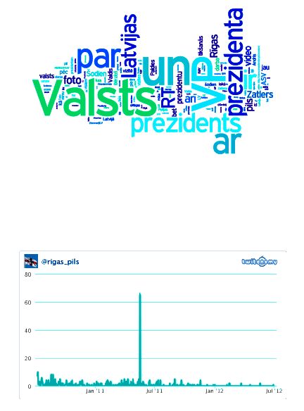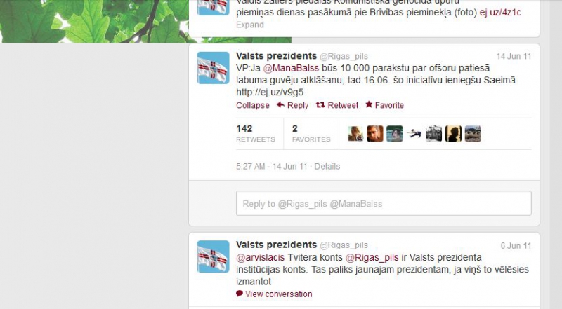 Профиль президента Латвии в Twitter (@Rigas_pils) зарегистрирован 7 июля 2010 года, когда президентом был еще Валдис Затлерс. В основном сообщения в микроблог пишут сотрудники пресс-службы, но сообщения, написанные президентом, можно распознать по подписи VP (valsts prezidents). Большая часть твитов – о ежедневных обязанностях и работе президента. Говоря о Затлерсе, стоит заметить, что он нередко вступал в дискуссии со своими читателями.