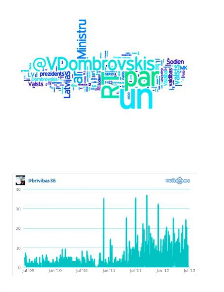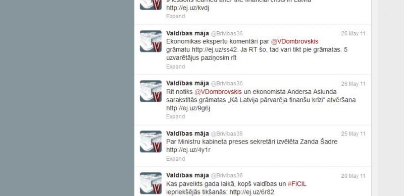 Официальный блог правительства Латвии Valdības māja (@Brivibas36) создан, чтобы информировать общество об актуальных событиях в работе правительства, в том числе и о работе премьер-министра Валдиса Домбровскиса. Самая популярная запись в блоге – от 26 мая 2011 года: «Комментарии экономистов о книге @VDombrovskis https://ej.uz/ss42. Если ретвитнешь эту запись, можешь получить книгу. Пятерых победителей объявим завтра»