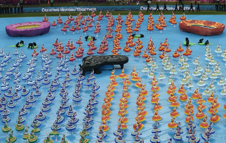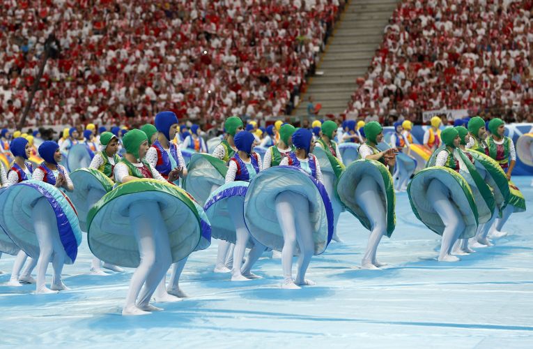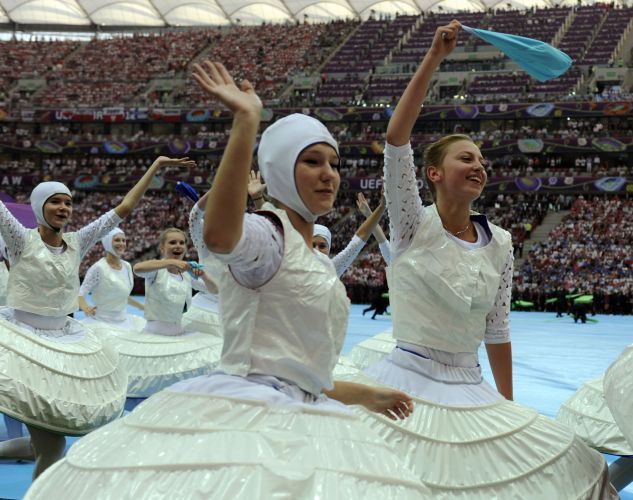 Шоу длилось 12 минут и представляло собой современный перформанс, который соединил символы спорта национальной культуры принимающих стран – Польши и Украины.