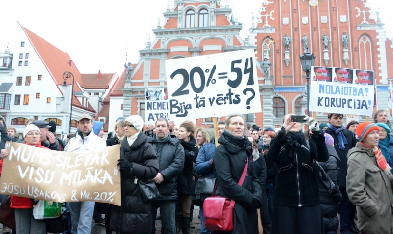На площади собрались сотни людей, которые держали в руках флаги Риги и множество плакатов, на которых были написаны слова поддержки Ушакова и предложения искать виновных в правительстве. Собравшиеся кричали «Ушаков! Ушаков!», стучали в барабаны и свистели в свистки и дудки.
