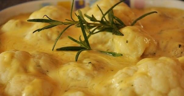 Слить воду из цветной капусты, дно противня смазать сливочным маслом, выложить в противень капусту и залить смесью сливок и сыра. Поставить противень с капустой в духовку, разогретую до 200 градусов, на десять минут.