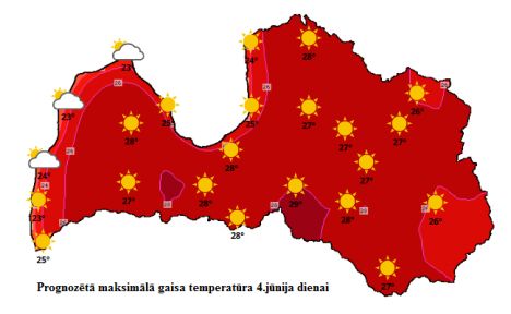 Латвийский центр окружающей среды, геологии и метеорологии предупреждает, что в Риге и Латвии с 4 по 8 июня ожидается жара — температура воздуха достигнет +31 градуса.