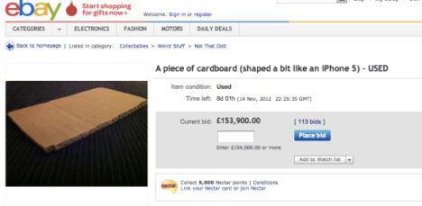 У новейшей модели смартфона производства американского гиганта Apple появился конкурент. В интернет-магазине eBay выставлен кусок картона, который отдаленно напоминает iPhone 5.