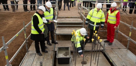 Председатель правления Международного аэропорта Рига Алдис Мурниекс вместе с авторами проекта здания и строителями в четверг, 6 ноября, торжественно дал старт строительству здания нового пирса, замуровав в фундамент капсулу с посланием к будущим поколениям.