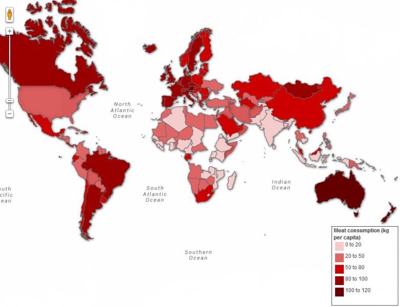 Так, один житель стран, окрашенных в бледно-розовый цвет (например, Индия), за год съедает от 0 до 20 кг мяса, а потребление мяса в странах, окрашенных в темно-красный цвет, составляет от 100 до 120 кг на одного жителя в год.