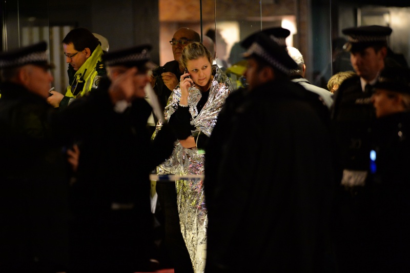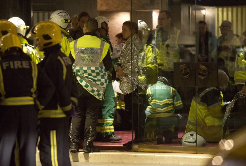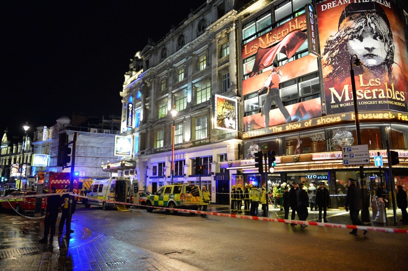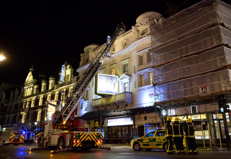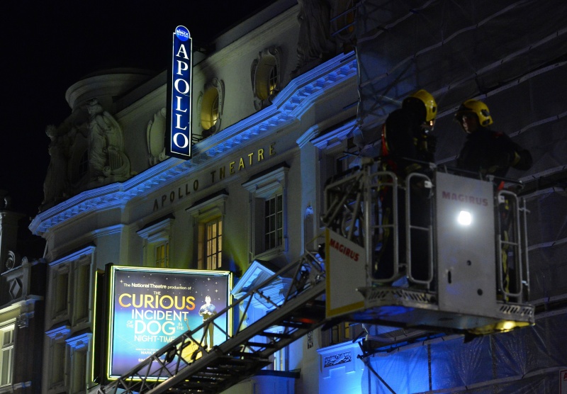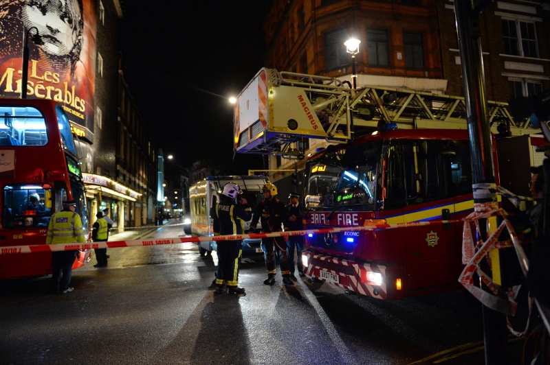 Корреспондент агентства Reuters сообщил, что машины спасательных служб заблокировали улицу возле театра. Пожарная служба Лондона передала, что на месте происшествия работает восемь пожарных машин.