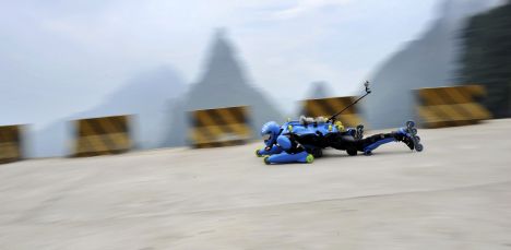 Французский изобретатель Жан-Ив Блондо (Jean-Yves Blondeau) в своем «роликовом» костюме в воскресенье, 22 июля, успешно съехал вниз по горной дороге горы Тяньмень в Китае.