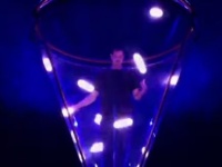 На этом видео показано, как артист цирка Грег Кеннеди, находясь в прозрачном конусе, жонглирует девятью светящимися шарами.